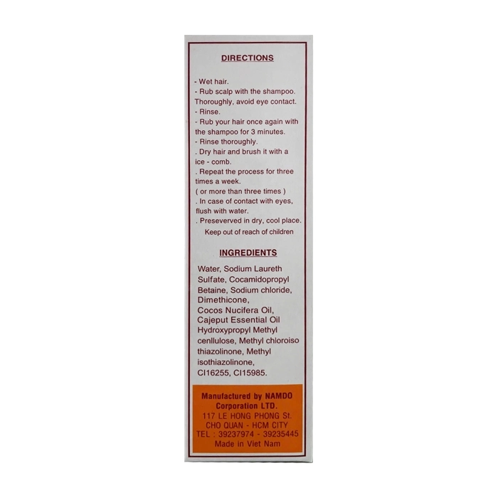 - Water, Sodium Laureth Sulfate, Cocamidopropyl Betaine, Sodium chloride, Dimethicone, Cocos Nucifera Oil, Cajeput Essential Oil, Hydroxypropyl Methyl cenllulose, Methyl chloroiso thiazolinone, Methyl isothiazolinone, CI16255, CI15985.